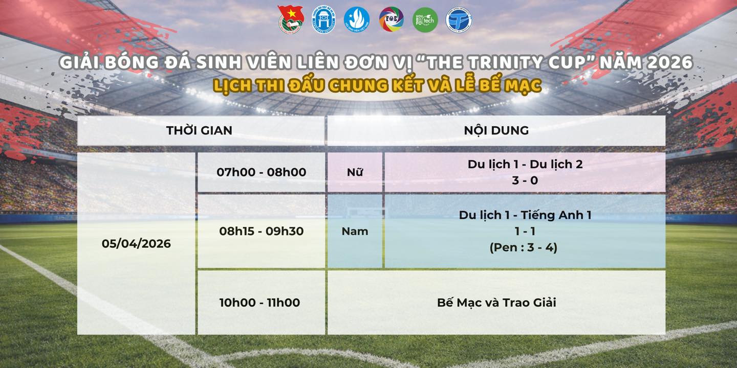 Ngày 05/04/2026, trận Chung kết và Lễ bế mạc giải bóng đá sinh viên liên đơn vị THE TRINITY CUP 2026 đã chính thức diễn ra, khép lại một mùa giải đầy cảm xúc. Khoa Du lịch đã ghi dấu ấn bằng tinh thần thi đấu nghiêm túc, đoàn kết và bền bỉ đến những phút cuối cùng.