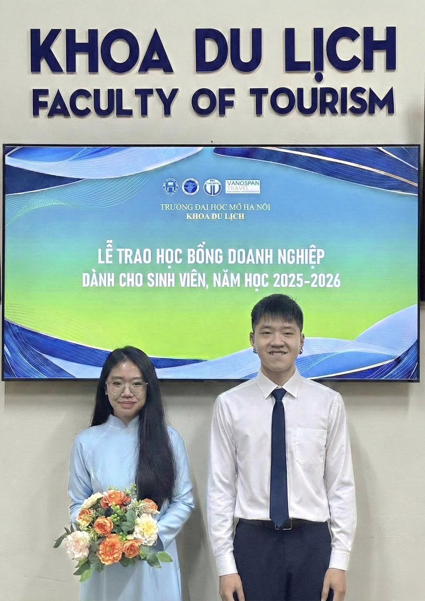 Nổi bật trong chương trình là 02 suất học bổng “Trao gửi niềm tin” do Công ty Cổ phần Du lịch Nối Vòng Tay (Handspan Travel) tài trợ, dành cho 02 sinh viên thủ khoa xuất sắc của hai ngành Quản trị Khách sạn và Quản trị Dịch vụ Du lịch và Lữ hành. Xin chúc mừng hai gương mặt tiêu biểu: