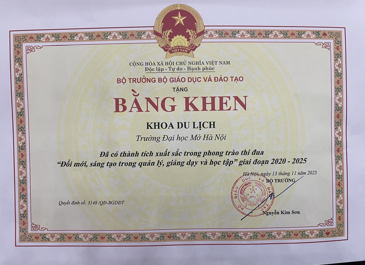 Tại Lễ kỷ niệm này, Khoa Du lịch, Trường Đại học Mở Hà Nội vinh dự đón nhận Bằng khen vì đã có thành tích xuất sắc trong phong trào thi đua “Đổi mới, sáng tạo trong quản lý, giảng dạy và học tập” giai đoạn 2020-2025. Đây là minh chứng và sự ghi nhận cho những nỗ lực không ngừng nghỉ của tập thể sư phạm FOT-HOU trong công tác giảng dạy, nghiên cứu khoa học, và đóng góp tích cực vào các phong trào thi đua của ngành giáo dục. Thành công này đến từ sự quan tâm, chỉ đạo sát sao của Đảng Uỷ, BGH Nhà trường; sự đồng hành ý nghĩa của các cơ quan quản lý nhà nước về du lịch, các đối tác doanh nghiệp, tổ chứctrong Ngành, và đặc biệt là sự sáng tạo, đổi mới không ngừng nghỉ của thầy và trò Khoa Du lịch, Trường Đại học Mở Hà Nội.